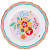 Descrição: Prato raso em porcelana, com fundo rosa claro decorado por um grande arranjo floral central em tons de amarelo, vermelho, azul e verde, acompanhado de pequenos detalhes como lua e estrelas. A borda possui acabamento ondulado, em vermelho com padrões geométricos e detalhe azul delicado no contorno. Uma peça vibrante e charmosa, ideal para compor uma mesa posta cheia de personalidade.