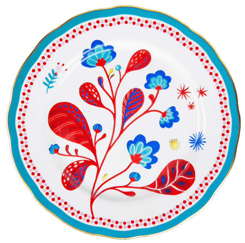 Descrição: Prato raso em porcelana com estampa floral em tons vibrantes de vermelho e azul, criando um contraste elegante e moderno. A borda em azul turquesa com friso dourado valoriza ainda mais o design, tornando a peça sofisticada e ideal para compor mesas postas cheias de estilo e personalidade.