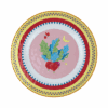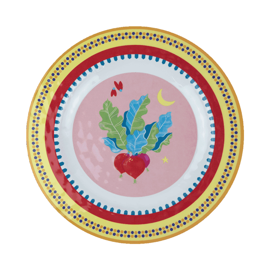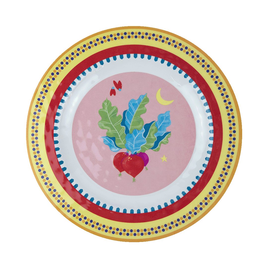 Descrição: Prato raso em melamina com estampa central de vegetais coloridos sobre fundo rosa, trazendo um ar lúdico e descontraído à peça. A borda amarela é adornada por padrões geométricos em azul e vermelho, criando contraste vibrante e detalhado. Ideal para composições de mesa criativas, cheias de cor e estilo.
