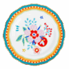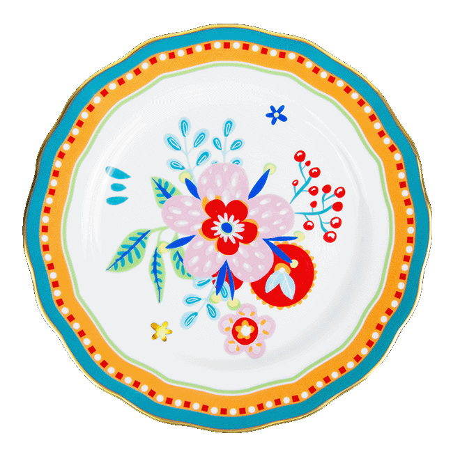 Descrição: Prato de sobremesa em porcelana, com estampa central floral em cores vivas, trazendo flores em tons de rosa, vermelho, azul e verde. A borda apresenta acabamento ondulado, em amarelo com detalhes geométricos vermelhos e contorno azul, que realça ainda mais a peça. Uma opção delicada e vibrante, perfeita para completar a mesa posta com charme e sofisticação.