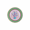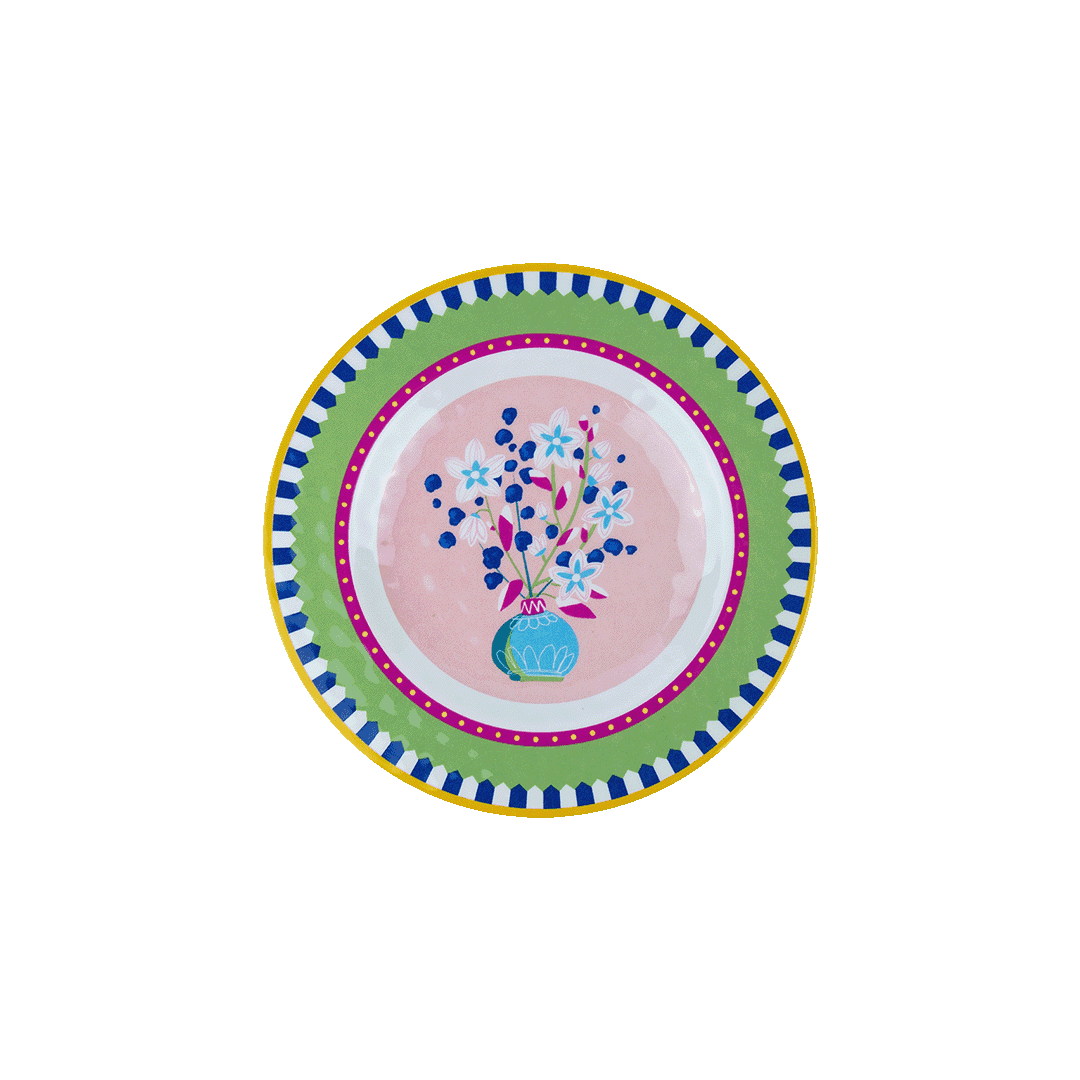 Descrição: Prato de sobremesa em melamina, com estampa delicada de vaso com flores coloridas sobre fundo rosa. A borda em verde com detalhes listrados em azul e amarelo traz um toque moderno e alegre. Ideal para servir sobremesas com praticidade e charme, perfeito para compor mesas criativas no dia a dia ou em encontros descontraídos.