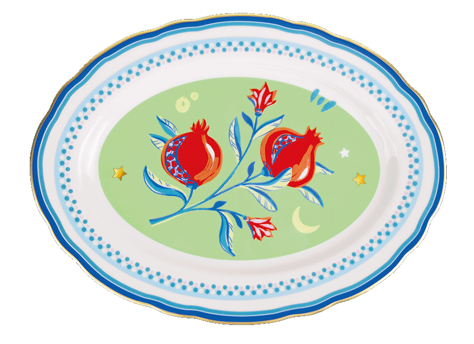 Descrição: Travessa oval em porcelana, com estampa vibrante de romãs e flores sobre fundo verde suave. A borda azul com detalhe em friso dourado realça a sofisticação da peça. Ideal para servir pratos principais ou entradas com elegância, tornando a mesa ainda mais charmosa em ocasiões especiais.