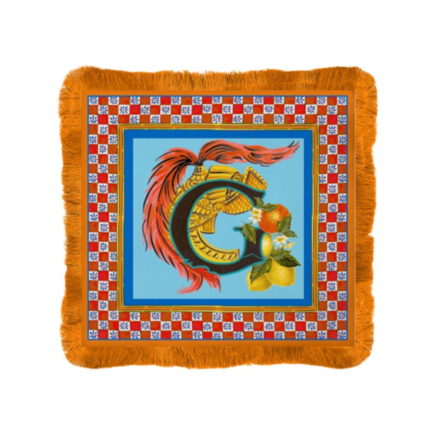 Descrição: Jogo americano em algodão, com a letra G em evidência em uma composição vibrante que mistura ornamentos e frutas em tons marcantes. O fundo azul contrasta com a borda xadrez vermelho e branco, finalizada com franjas laranja que trazem um toque sofisticado e alegre. Uma peça única para compor mesas cheias de estilo, ideal para o dia a dia ou ocasiões especiais.