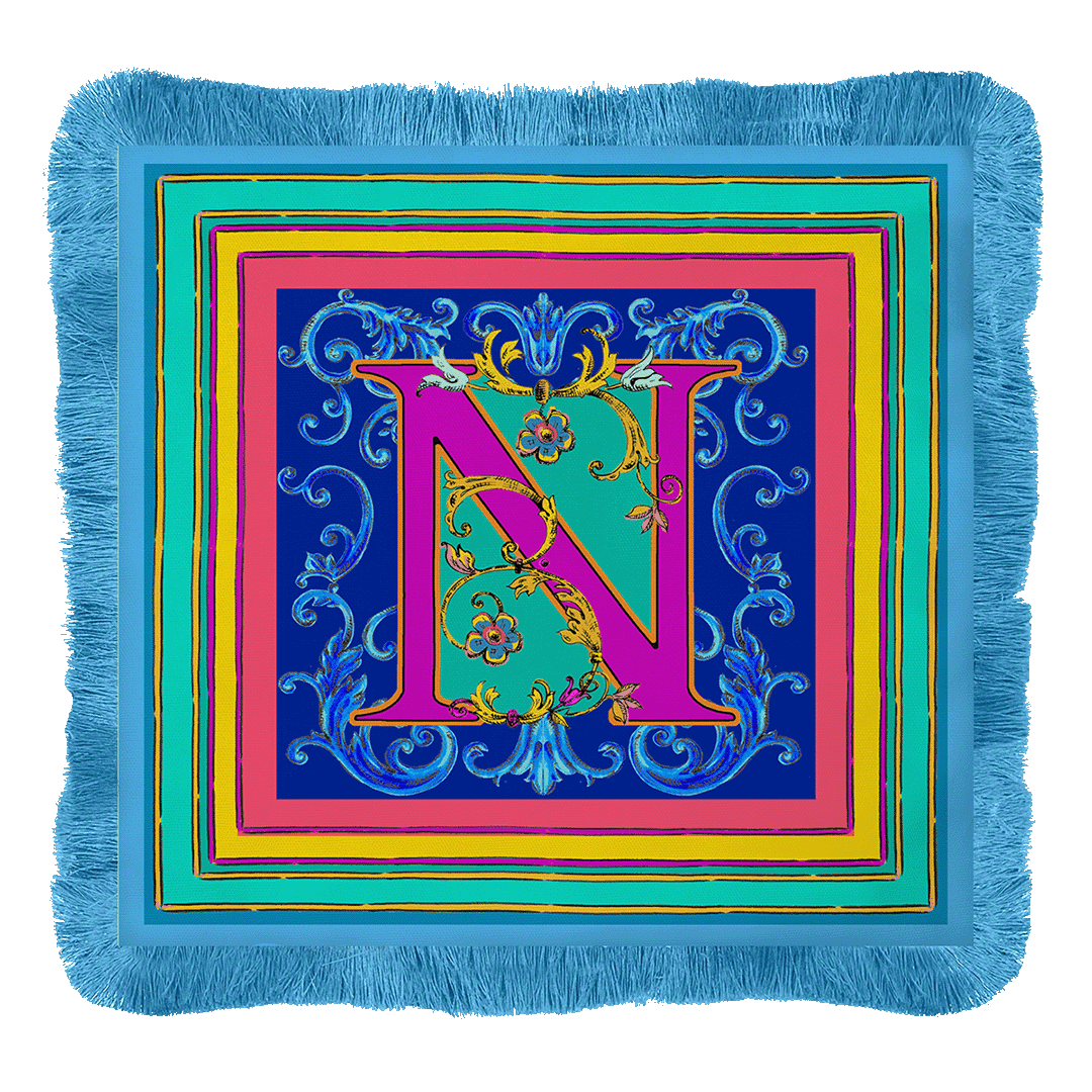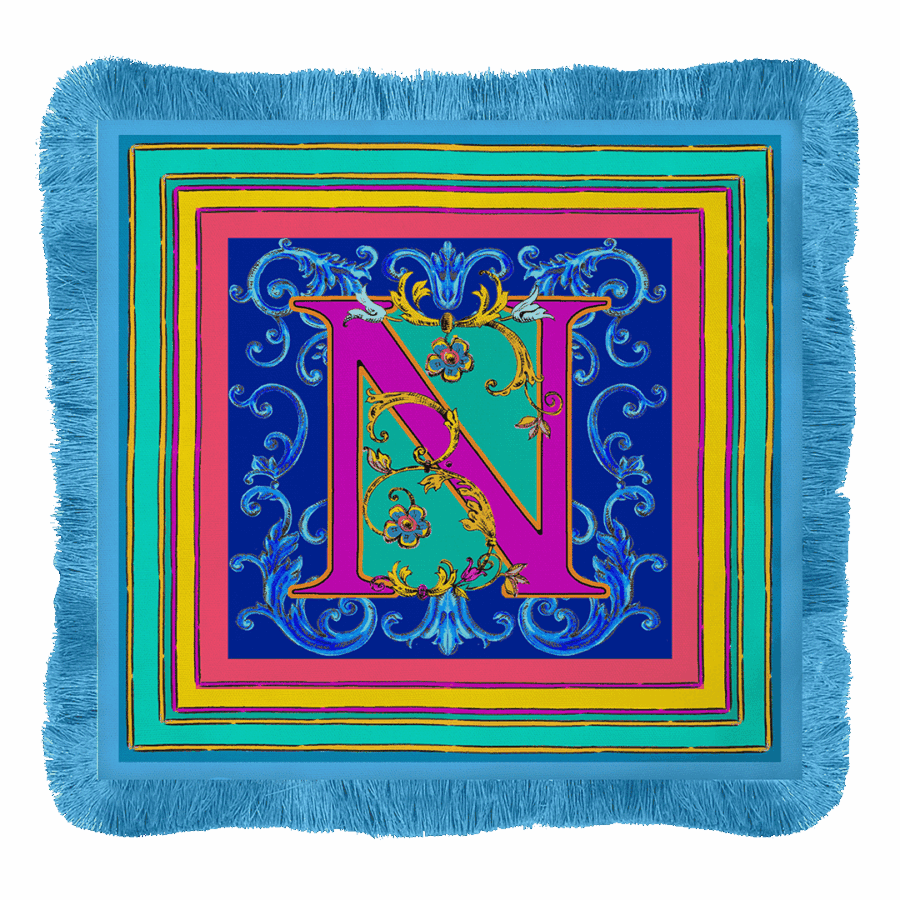 Descrição: Jogo americano em algodão, com a letra N em destaque em estampa ornamental vibrante, realçada por arabescos em azul e detalhes coloridos. O fundo intenso é emoldurado por faixas multicoloridas e finalizado com franjas azul-claro que acrescentam sofisticação. Uma peça cheia de personalidade, ideal para compor mesas criativas e elegantes tanto no dia a dia quanto em ocasiões especiais.
