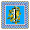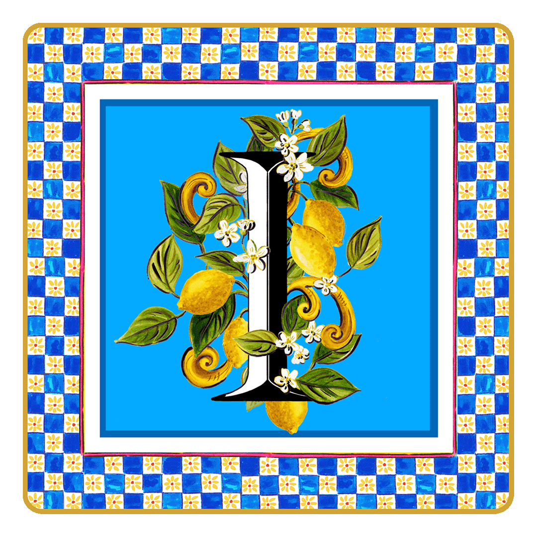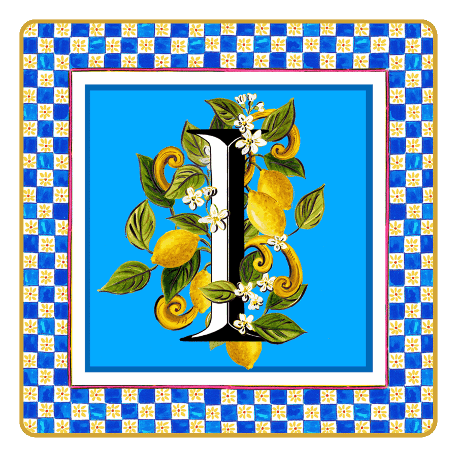 Descrição: Porta objetos em porcelana, com a letra I em destaque, decorada com limões e folhagens sobre fundo azul. A borda em padrão xadrez azul e amarelo completa o design. Peça prática e elegante para organizar pequenos itens ou decorar com charme.