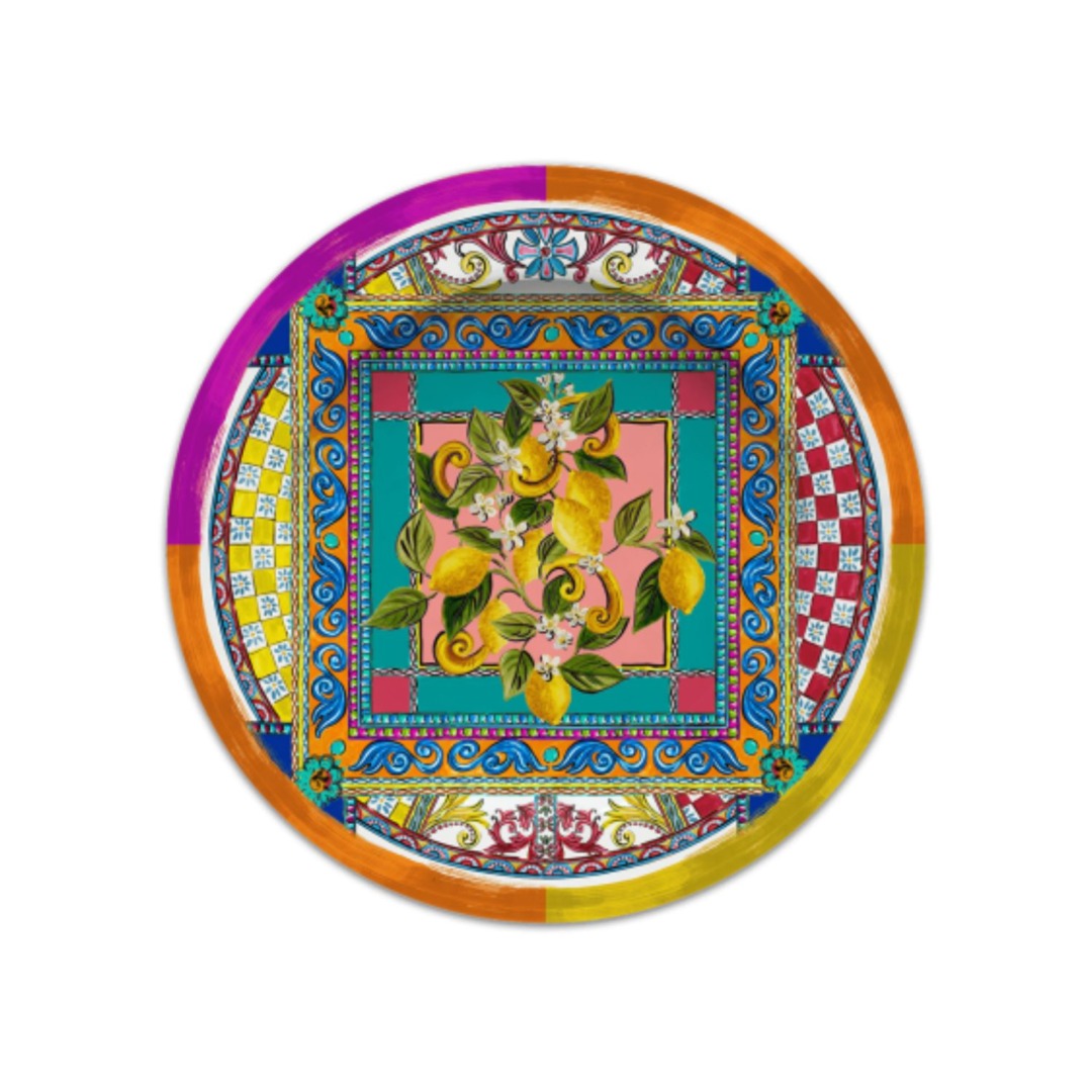 Descrição: Prato raso em melamina com estampa vibrante de limões e folhagens em composição colorida e detalhada. A borda multicolorida realça o design, tornando-o ideal para servir refeições com estilo e dar mais charme à mesa.