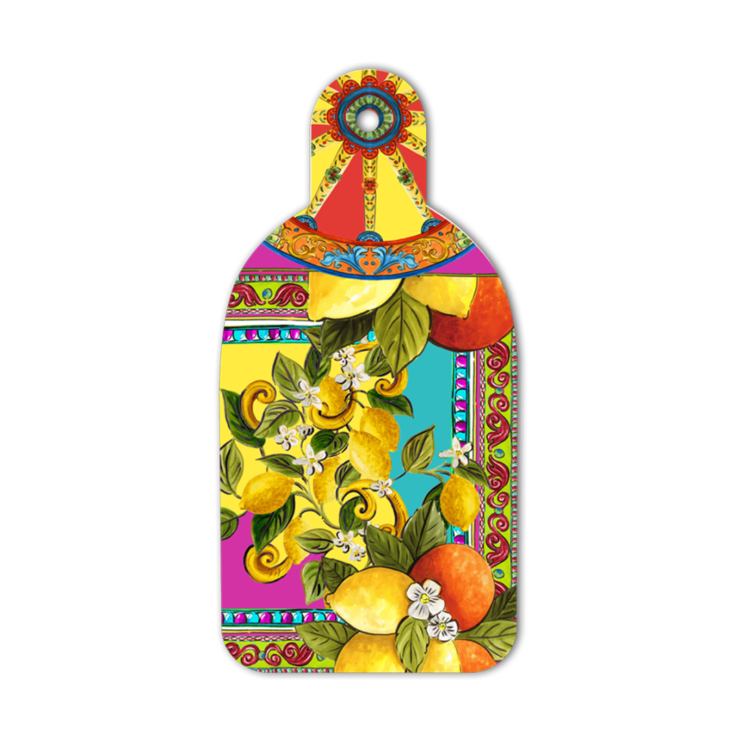Descrição: Tábua média retangular em melamina com estampa vibrante de limões e arabescos coloridos. Ideal para servir queijos, frios, pães ou até como base decorativa, trazendo charme e estilo para a mesa.