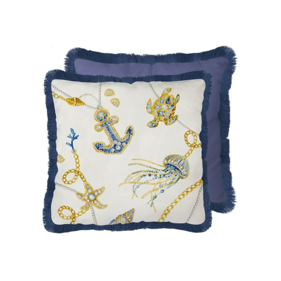 Descrição: Almofada em algodão com estampa de tema náutico, trazendo âncora, tartaruga e águas-vivas em detalhes dourados e azuis. O verso em azul sólido completa a peça com sofisticação. Ideal para decorar sofás, poltronas ou camas, acrescentando charme e personalidade ao ambiente.