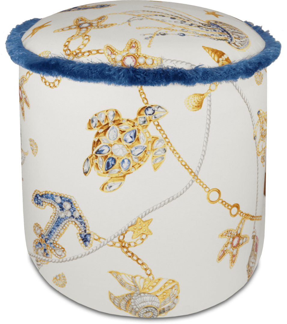 Descrição: Puff estofado em algodão com estampa de tema náutico, ilustrando tartarugas, âncoras e detalhes dourados que trazem sofisticação. O acabamento superior em azul adiciona contraste e elegância. Uma peça funcional e decorativa, ideal para compor ambientes com charme e personalidade.