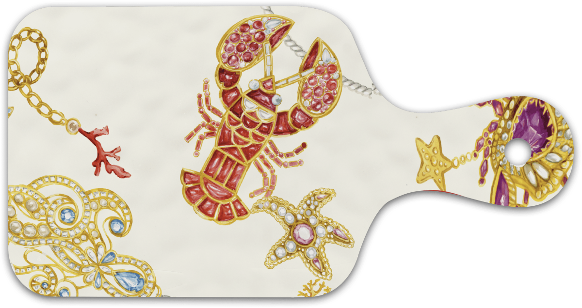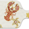 Descrição: Tábua pequena retangular em melamina com estampa de tema náutico, trazendo lagosta, estrelas-do-mar e corais em detalhes dourados e coloridos. Ideal para servir pequenas porções, queijos ou petiscos, acrescentando charme e sofisticação à mesa.
