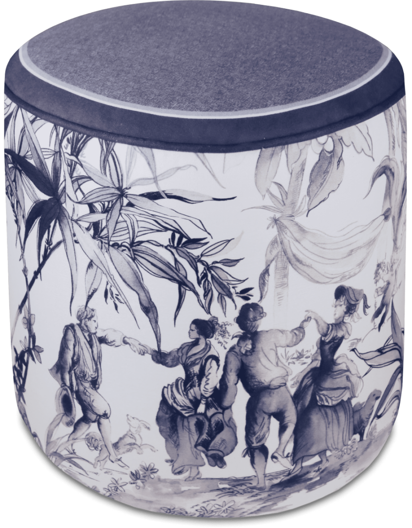 Descrição: Puff estofado com estampa clássica em azul e branco no estilo toile de jouy, trazendo cenas artísticas que remetem à tradição e elegância. Versátil e sofisticado, é perfeito para compor salas de estar, quartos ou espaços de leitura com charme atemporal.